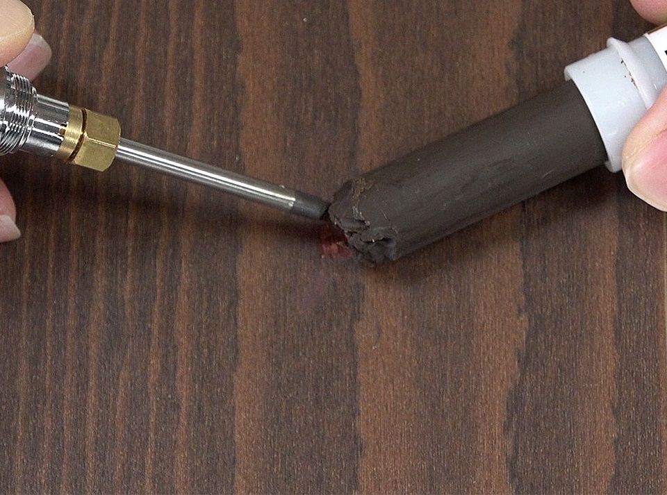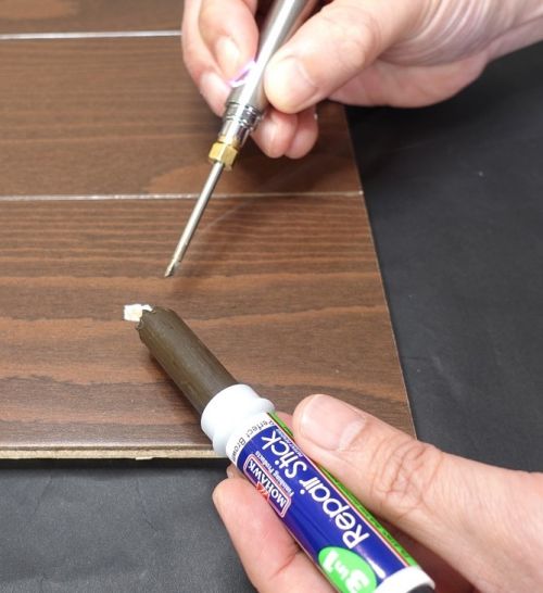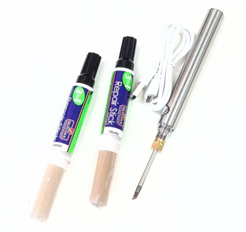 「補修専用ホットナイフ」1個と「スリーインワンリペアスティック」2本のセットですので、2色を混ぜ合わせて色を合わせながら補修する事ができます。