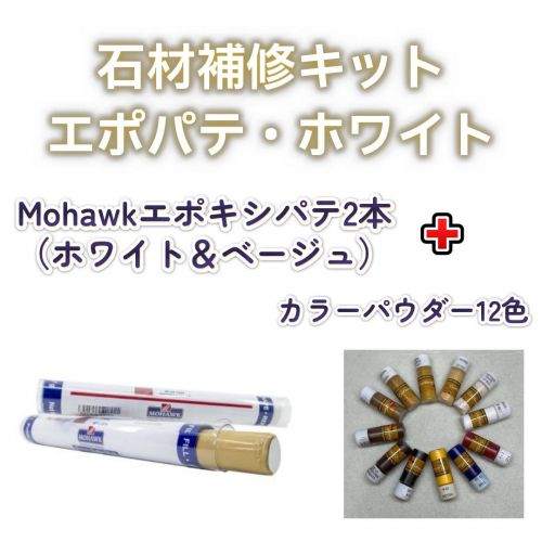 大理石などの石材、タイル、陶器用の二液エポキシ系接着剤・補修用パテとして高い評価を得ている「モホーク・エポキシパテ」のホワイト色と汎用性の高いベージュ色を各1本と補修用パテ・接着剤の色合わせに便利な「キャラフ・カラーパウダー5㎜」をセットにしました。