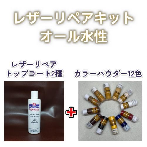 ・レザーリペアトップコートとキャラフ・カラーパウダー12色セット(黒・白・赤・青・黄の原色5本と茶系色7本の計12本セット)を混ぜる事で希望の色のレザー用塗料を作り出す事ができます。